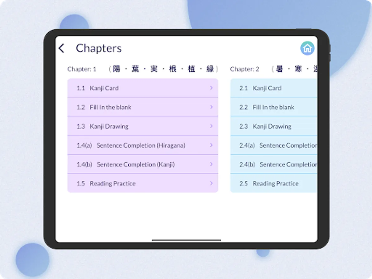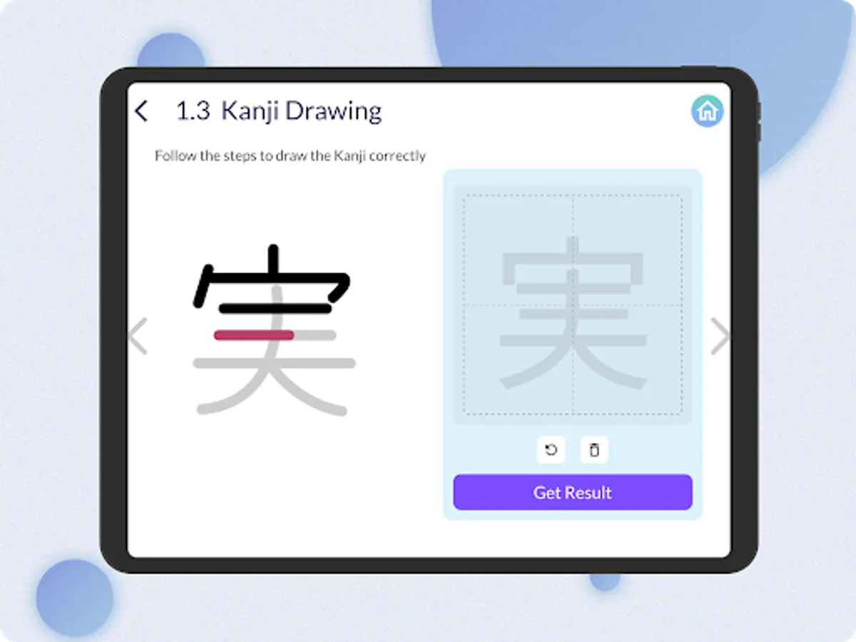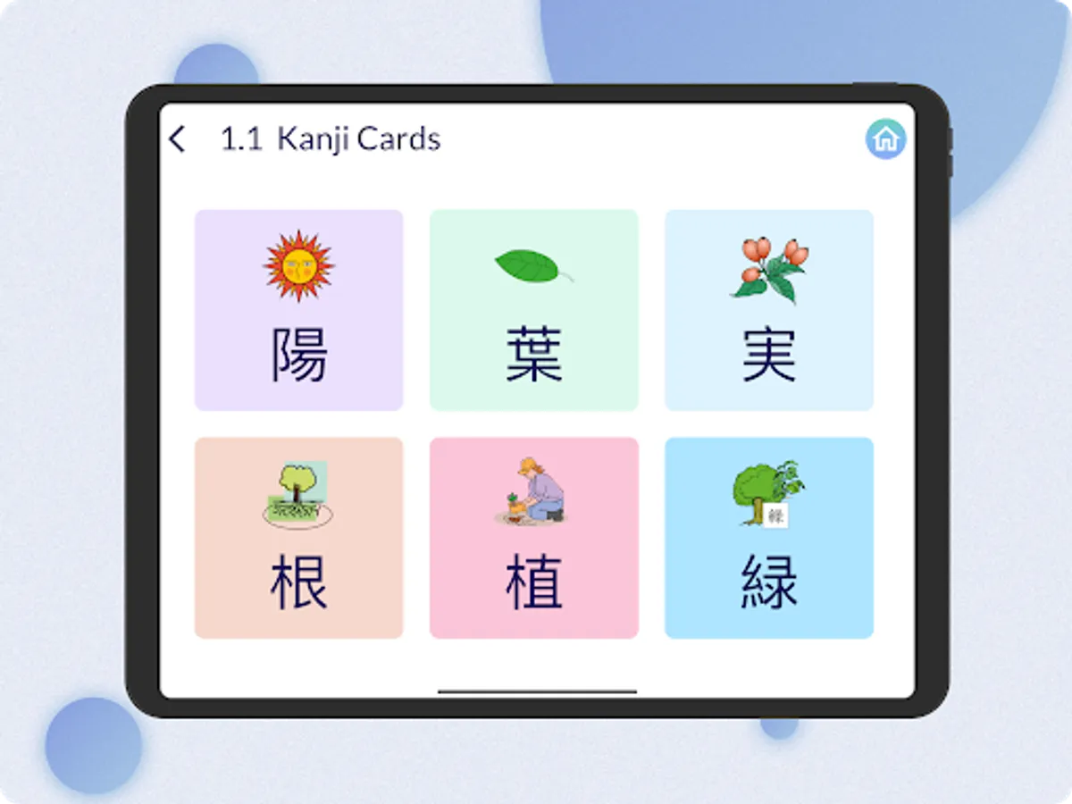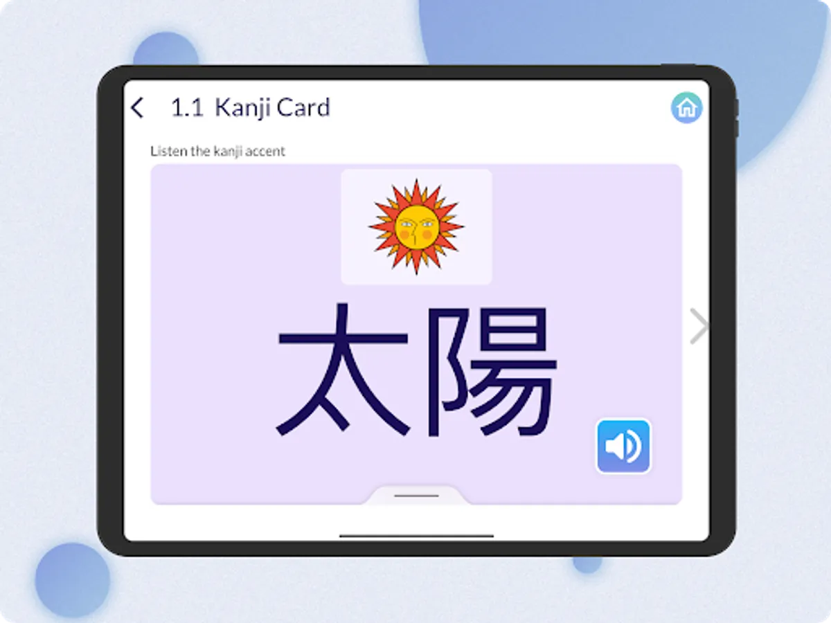 漢字に合わせたイラストを用いた説明に加えて、描画と連動した書き順の学習ができます。ドリル型の設問には効果音もあるため、クイズ感覚で学習できるでしょう。漢字の読み方も音声で聴けるだけでなく、録音機能も付けていますので、自分の声や講師の声などを何度でも聴き直すこともできます。