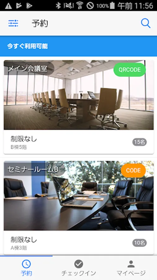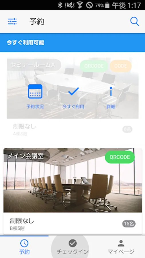 If you specify the date and time, the conference rooms that are available at that time will be narrowed down and displayed. In addition to reserving a vacant meeting room, there is also an option to use it immediately.