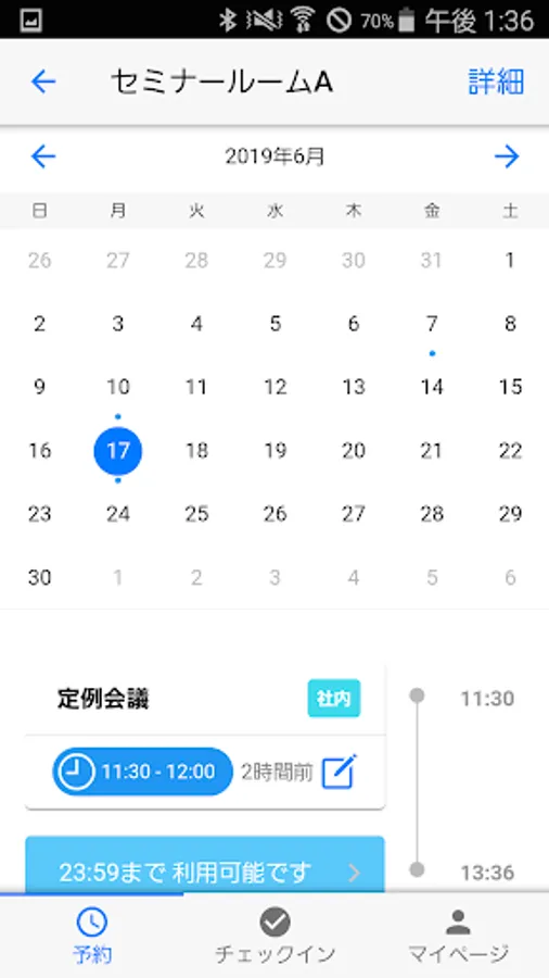 Check the reservation status and current usage status of conference rooms in a list or calendar view. You can also check whether the purpose is an internal meeting or a visitor, and add the meeting agenda.