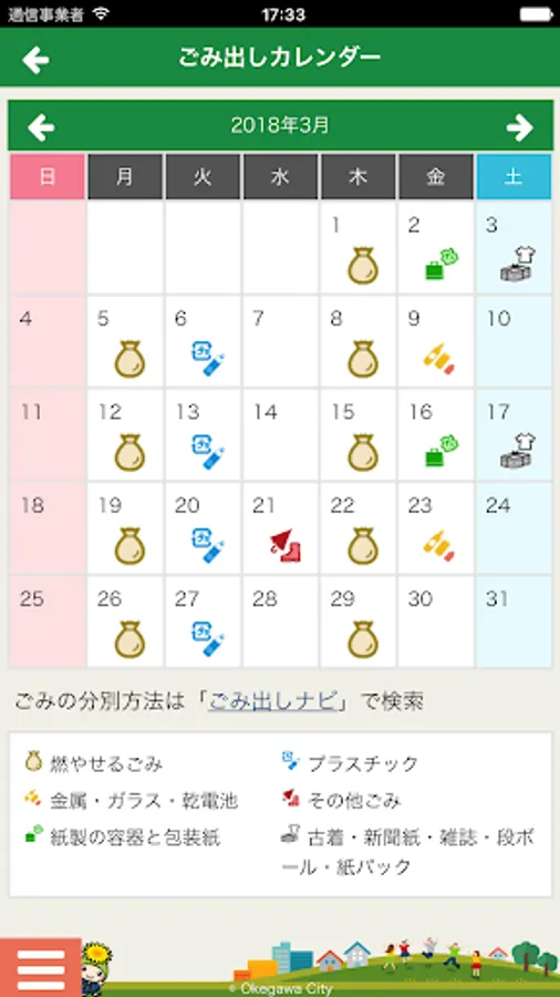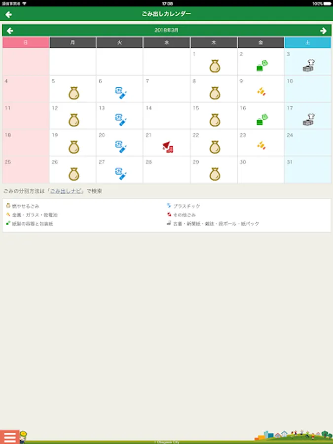 2.ごみ出しカレンダー(収集日前日にリマインド通知)&ごみの分別検索機能