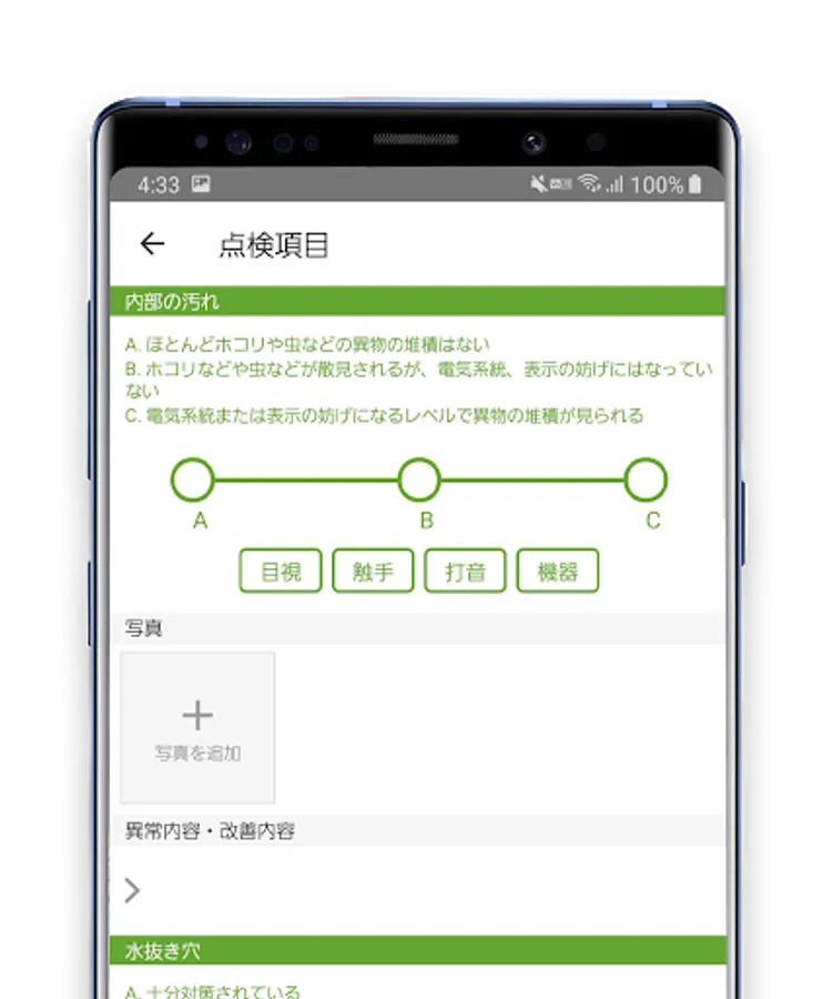 業界標準の点検基準に沿った、サインの種類ごとのテンプレートを搭載。画面の指示どおりにタップしていくだけで必要な点検が漏れなく完了します。
