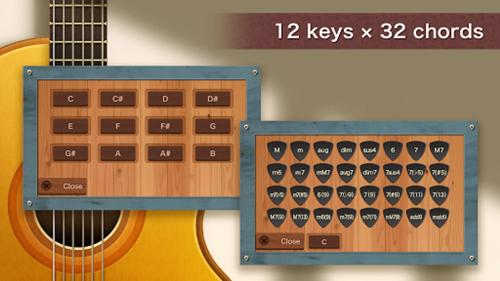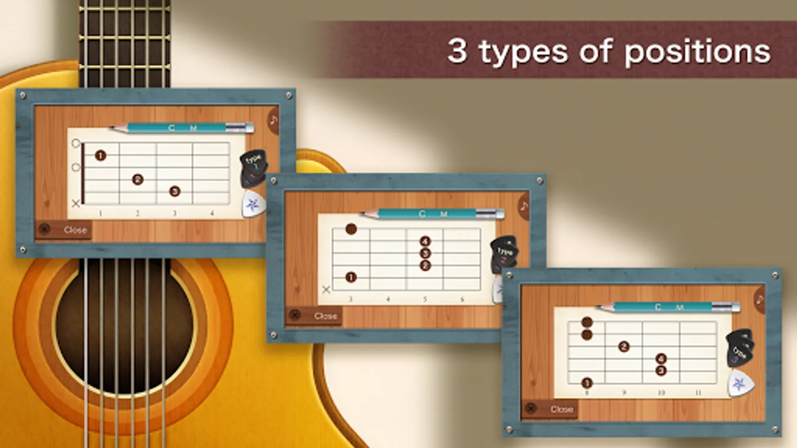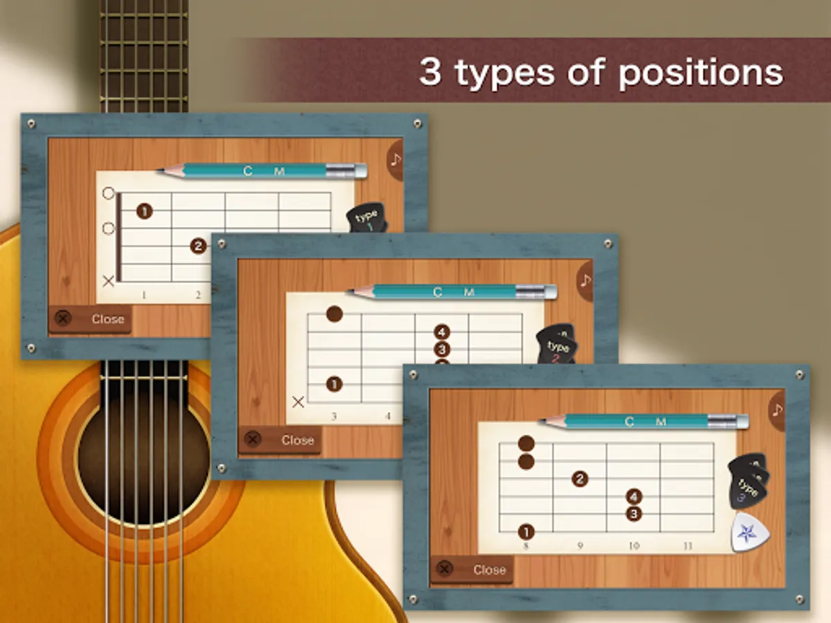 Also, it includes 3 types of fingering positions (how to press down), so there are 1152 kinds of guitar chord diagrams.