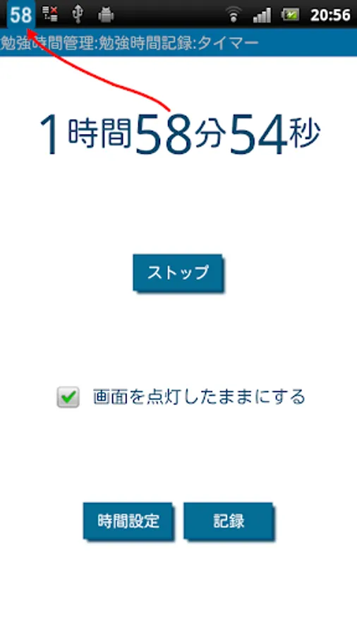 タイマー、ストップウォッチ動作時はステイタスバーに「分」の値が表示されるので、画面がロックされてしまっても「分」の値だけはすぐに確認できます。(3番目の図参照)