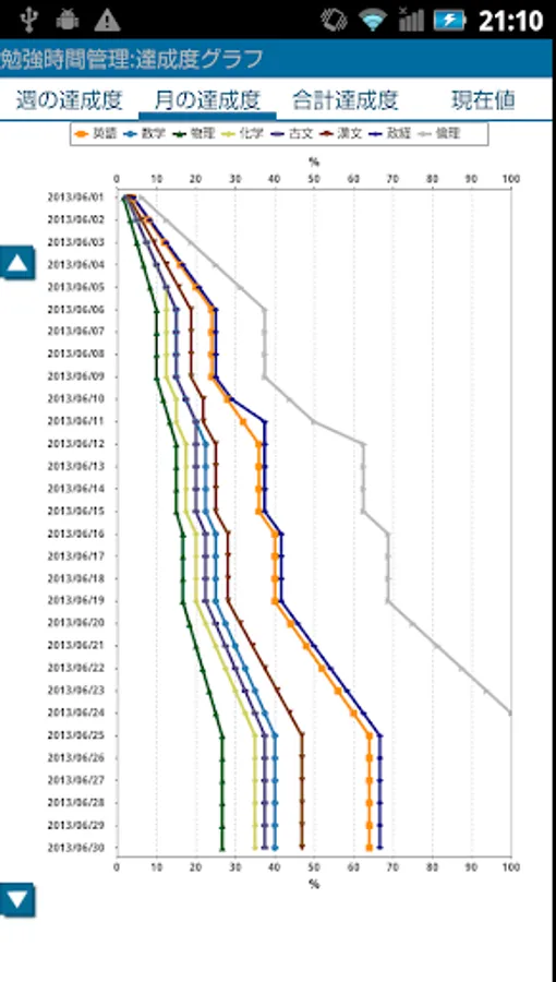 また、達成度グラフを表示するには「科目設定」画面で科目ごとに目標値を設定してください。