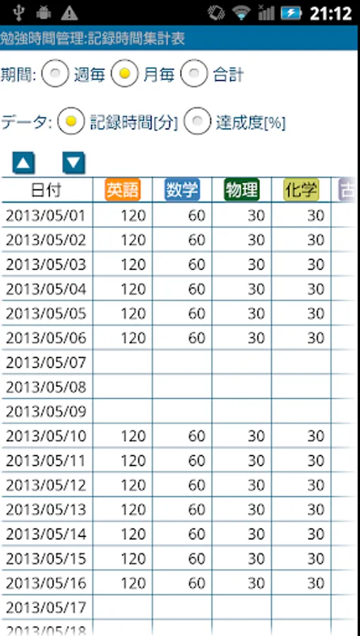 勉強時間は達成度グラフ、記録時間グラフ、集計表の形で確認できます。