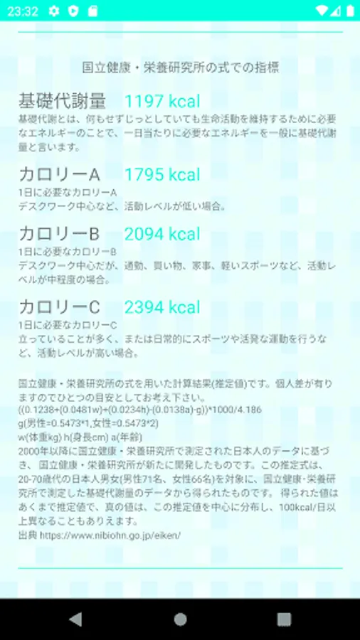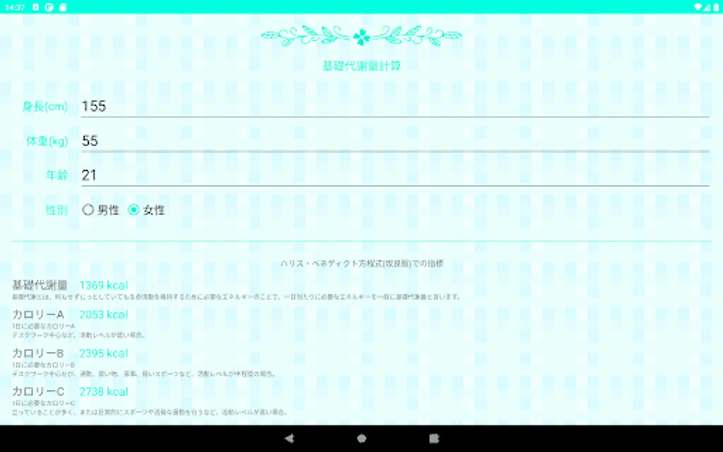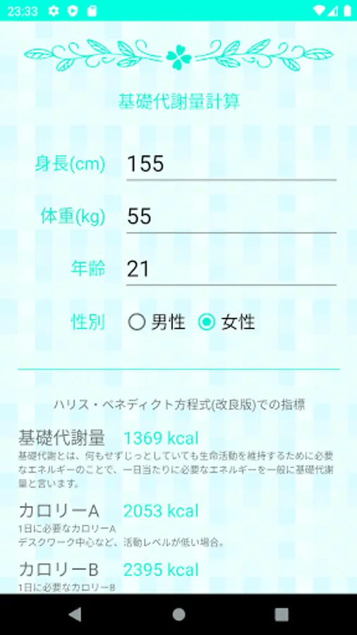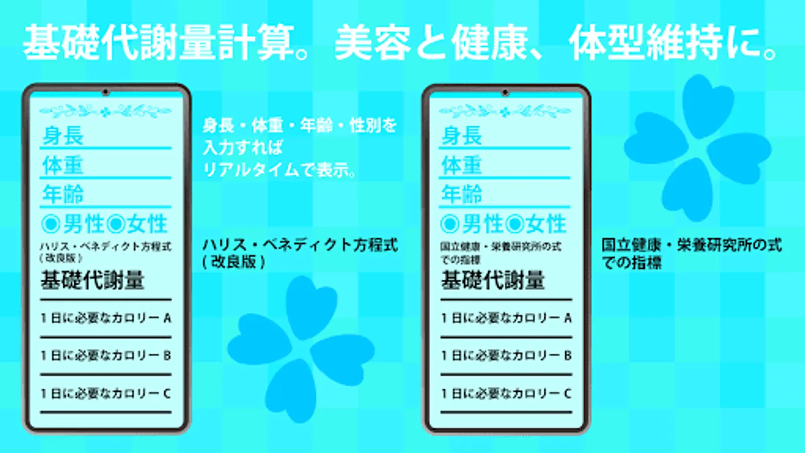 Basal metabolic rate is calculated using the Harris-Benedict equation (improved version) and the National Institute of Health and Nutrition formula. There is also a calorie count required for the day. Please use it for beauty, health and body shape maintenance.