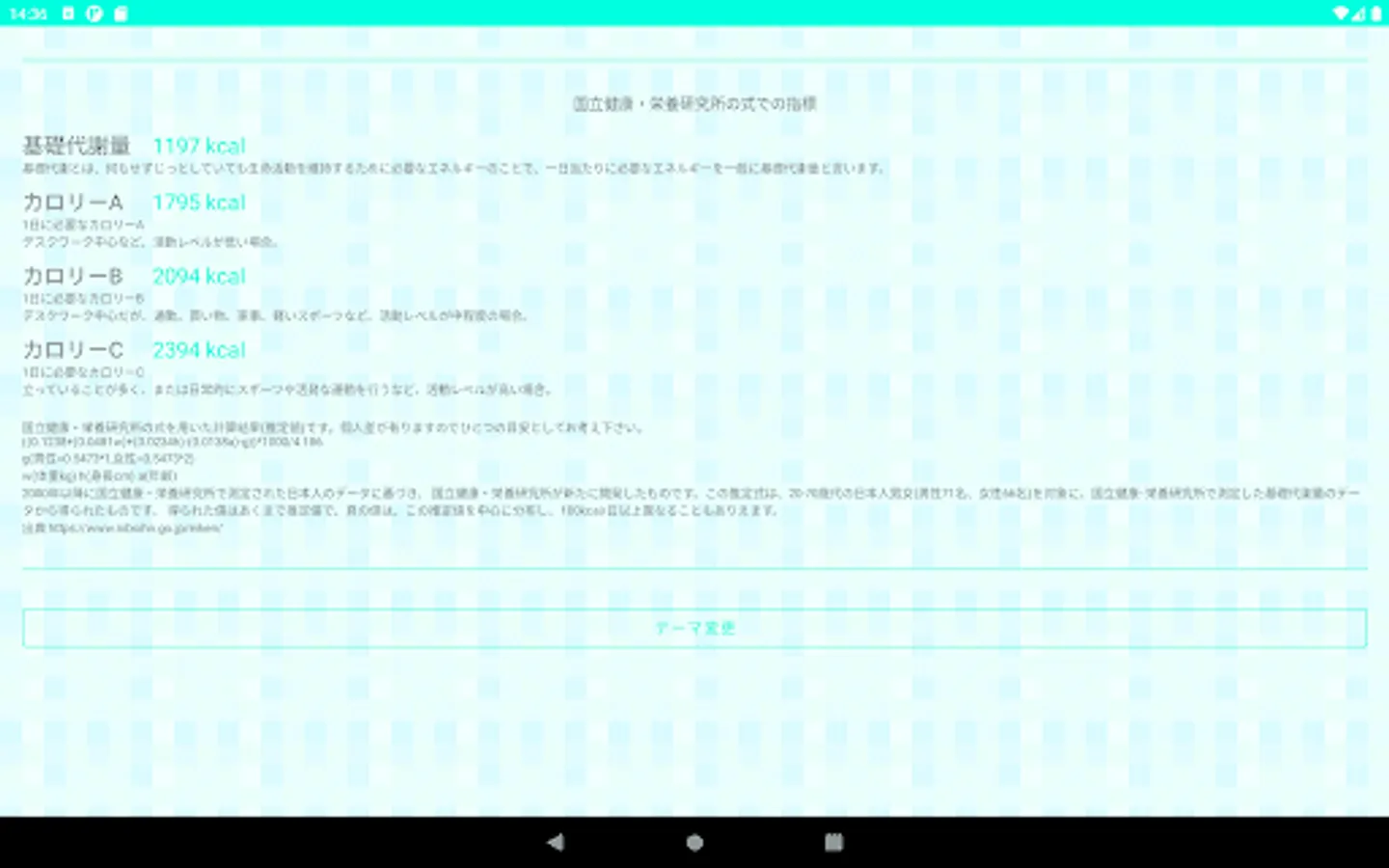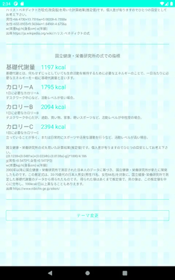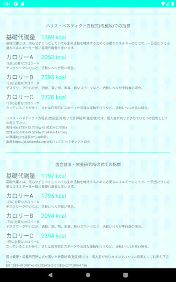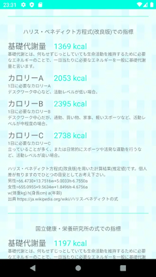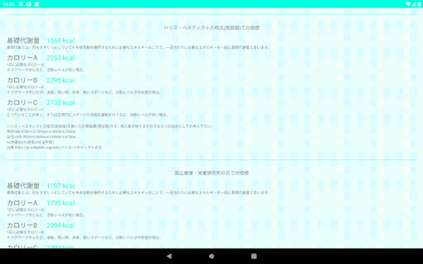 Basal metabolic rate is calculated using the Harris-Benedict equation (improved version) and the National Institute of Health and Nutrition formula. There is also a calorie count required for the day. Please use it for beauty, health and body shape maintenance.