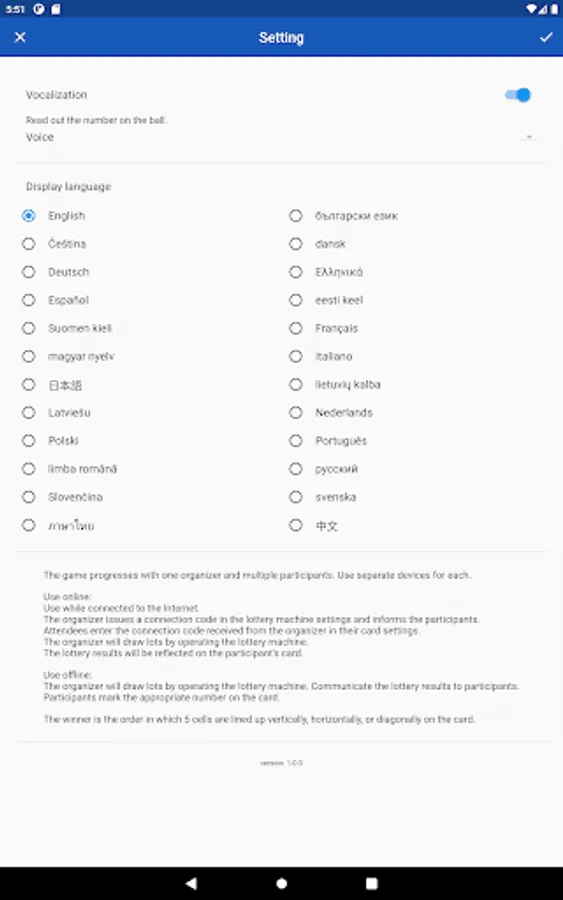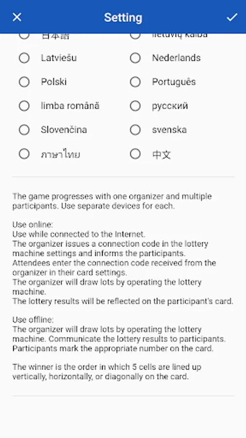 The organizer operates the bingo lottery machine. The lottery result will be automatically reflected on the participant's card.