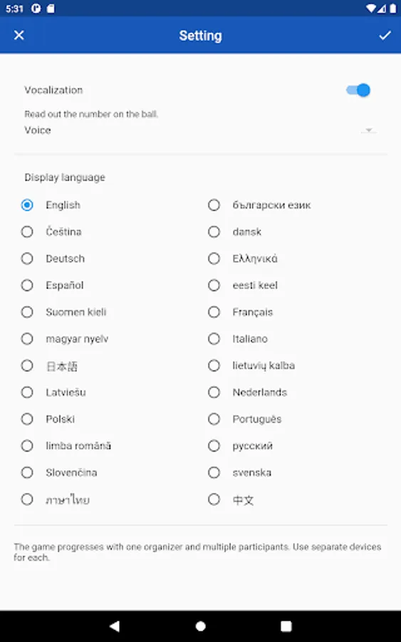 The game progresses with one organizer and multiple participants. Use separate devices for each.