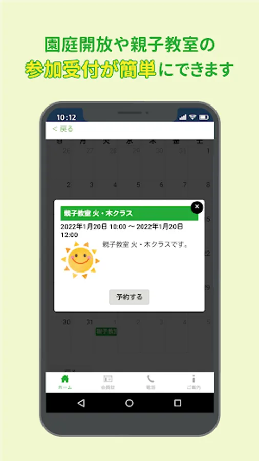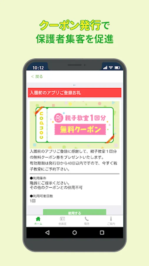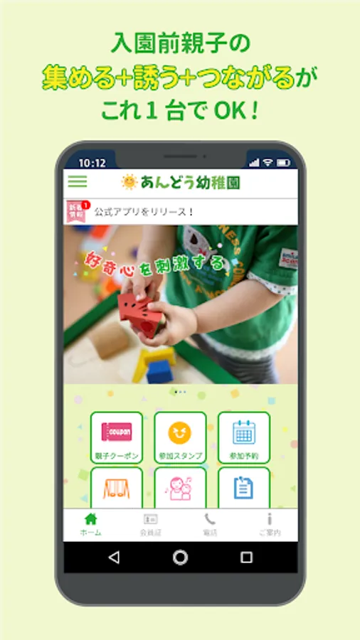 Pre-school child event before admission With functions such as information acquisition for contact information for visitors, issuance of classroom participation coupons, participation stamps, event calendar display and participation reservation, individual and group contact, parents and children before admission can be sent to parent-child events. It is an application full of communication devices that supports from visiting the park to submitting the application for admission.