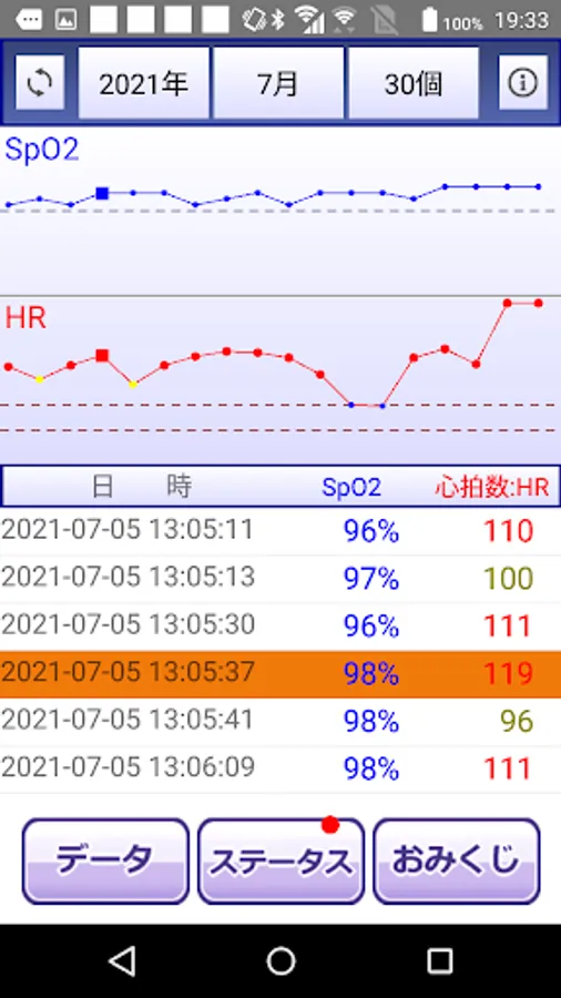 We manage SpO2 value (percutaneous oxygen saturation) and HR (heart rate) data collected by our products and display them in a graph.