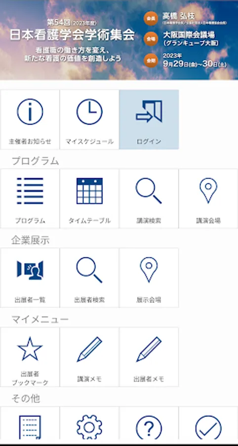 This app is an electronic abstract app for the 54th (2023) Japanese Society of Nursing Academic Conference (Osaka). You can create your own conference schedule by searching and registering sessions and lectures, and you can leave notes for each lecture.