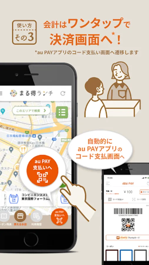 ■ au PAY code payment function You can make a payment with a Marutoku lunch coupon just by displaying the payment barcode of the au PAY app and scanning the code with one click, or by scanning the QR code displayed at the store. increase. Service page: https://www.kddimatomete.com/lp/meal-allowance/user/