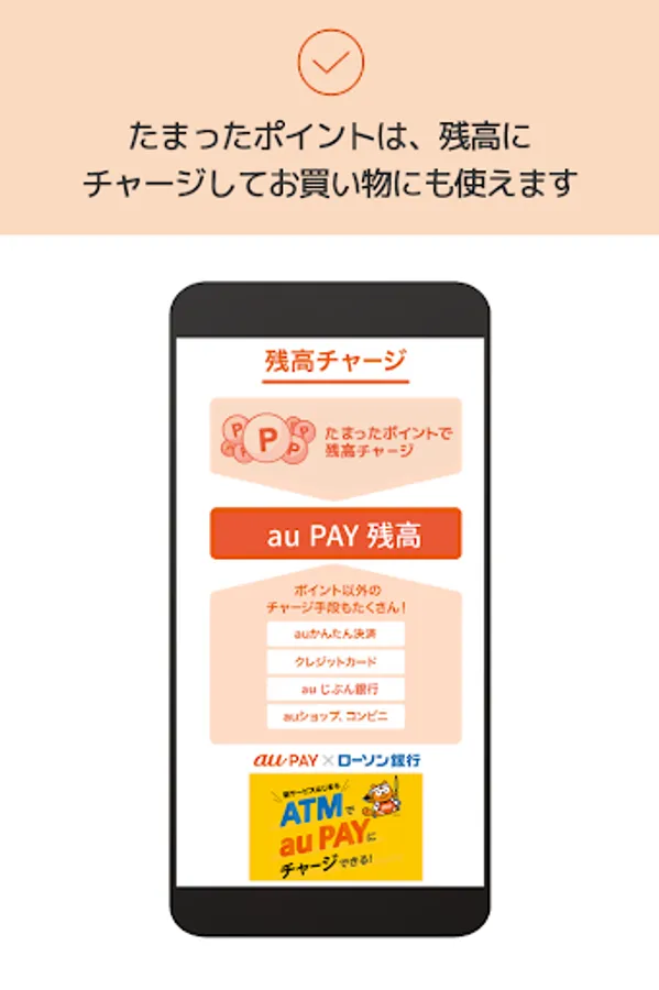 Use au PAY payment, check au PAY card information, charge to au PAY balance, charge balance, number of points held, usage history, check available shops and point-up shops, etc. on a screen optimized for smartphones. Available.
