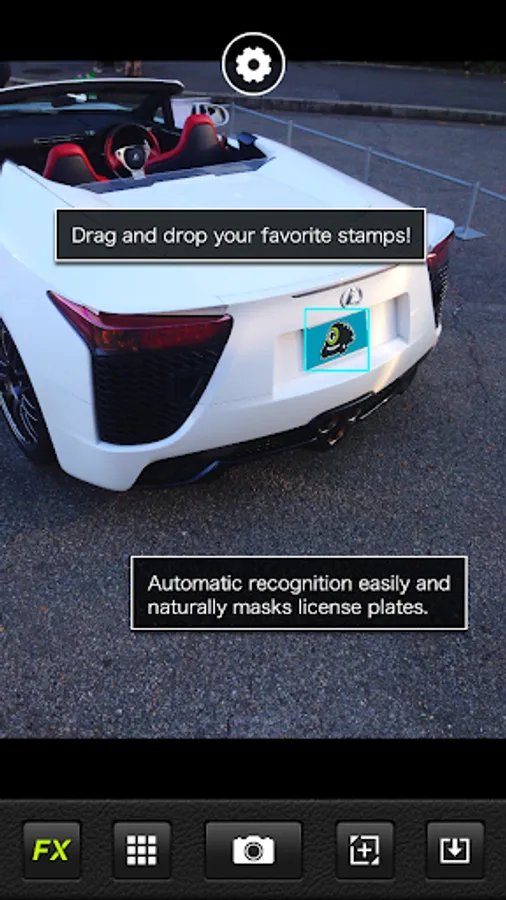 Automo Camera can automatically mask license plates from car photos taken with the app or selected from your library. New to the app is the Stamp Feature which allows the user to stamp their favorite brand logo, car club logo and event logo to their own photos.