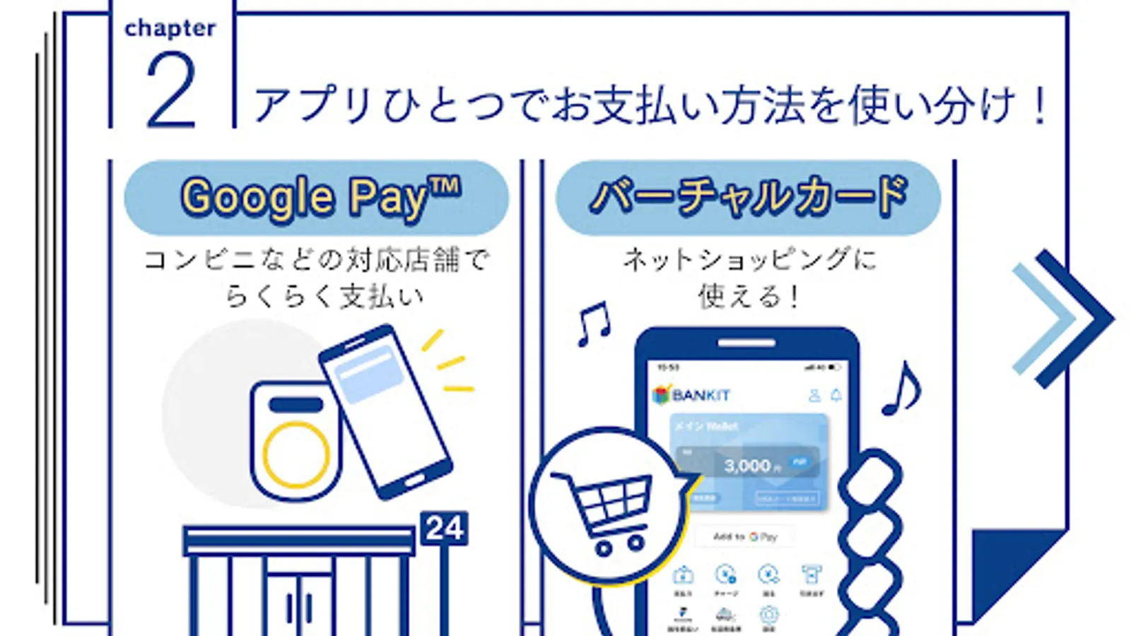 You can register BANKIT with Google Pay, which can be easily used at QUICPay+ merchants, simply by holding your smartphone over it.