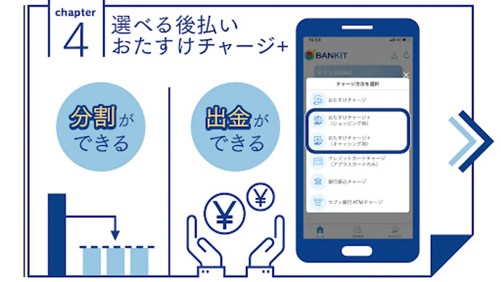 You can charge your BANKIT with Seven Bank ATM, bank transfer, credit card, Otasuke Charge + (Plus), Otasuke Charge.
