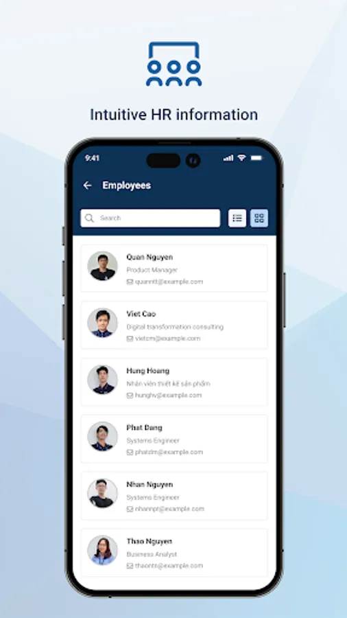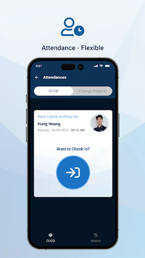 - Attendances: Check in/ Check out linh hoạt, dữ liệu chấm công cập nhật theo thời gian thực.