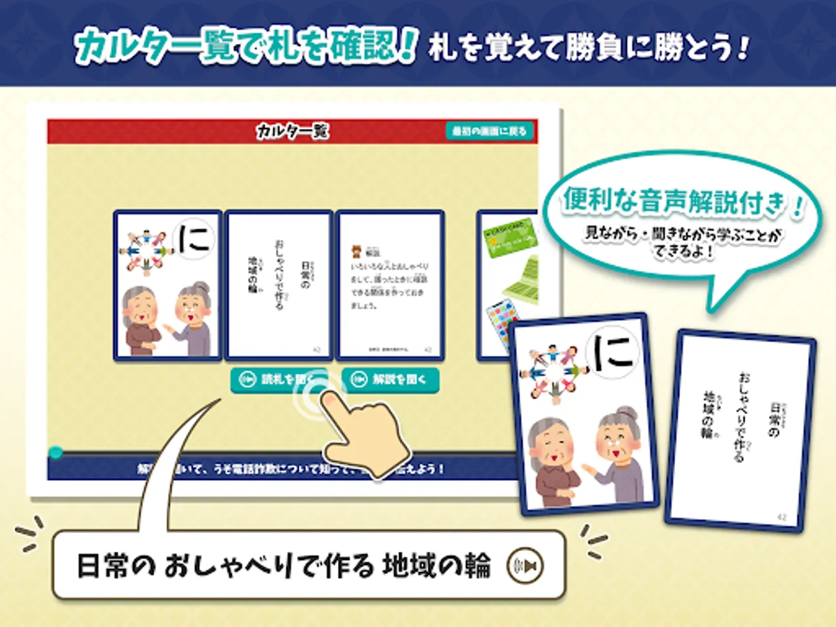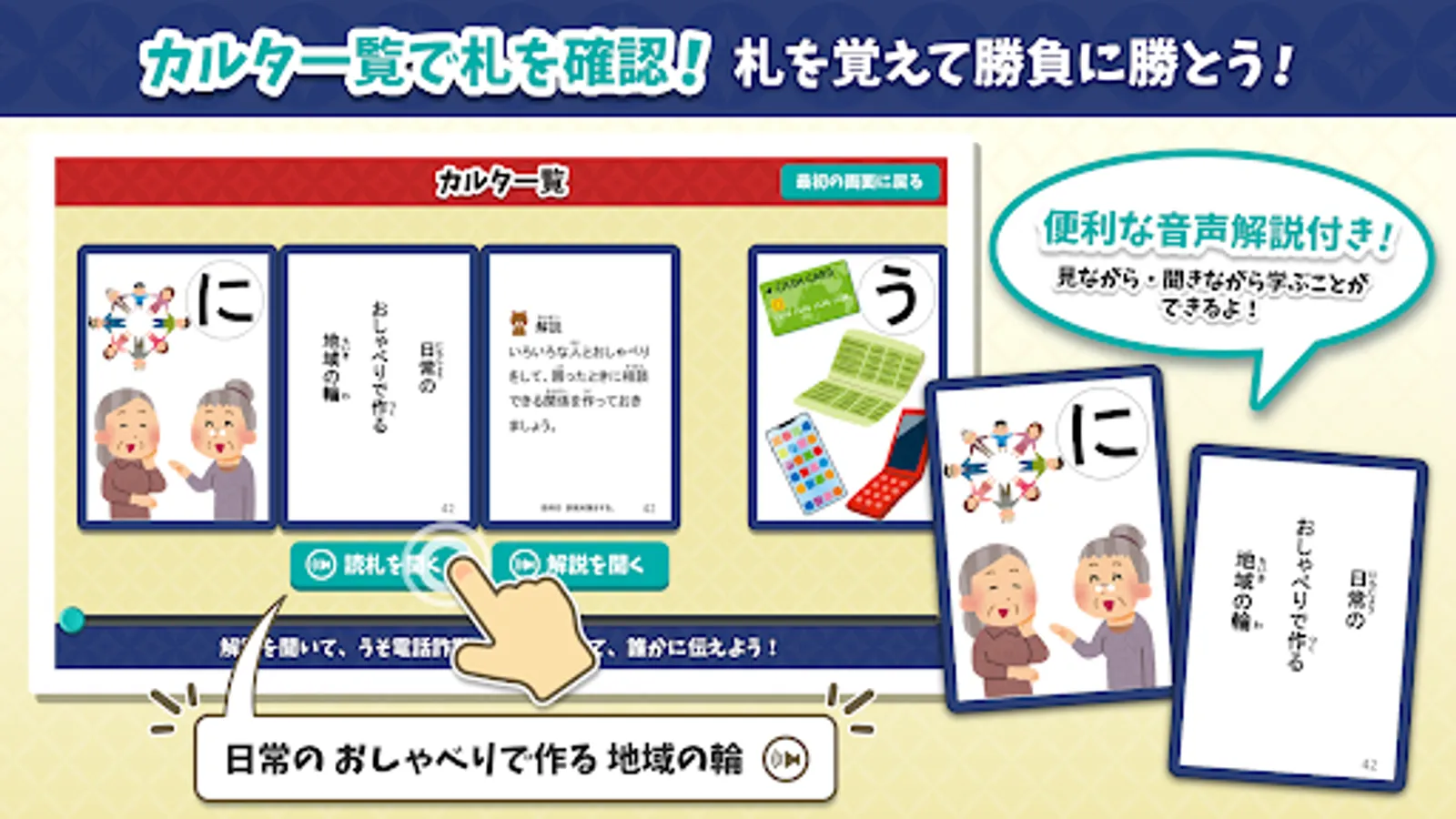 ◆ In the "Karuta List", you can see the cards, reading cards, and commentary cards.