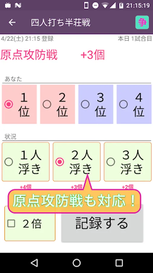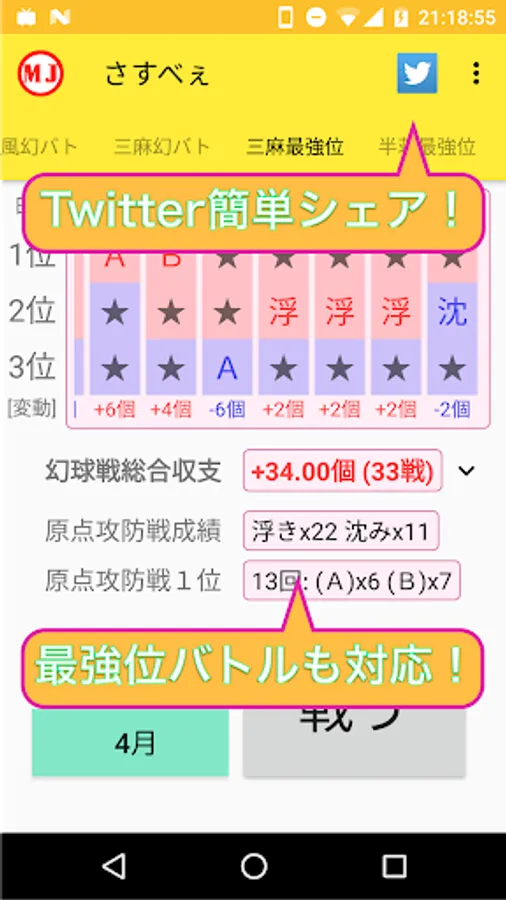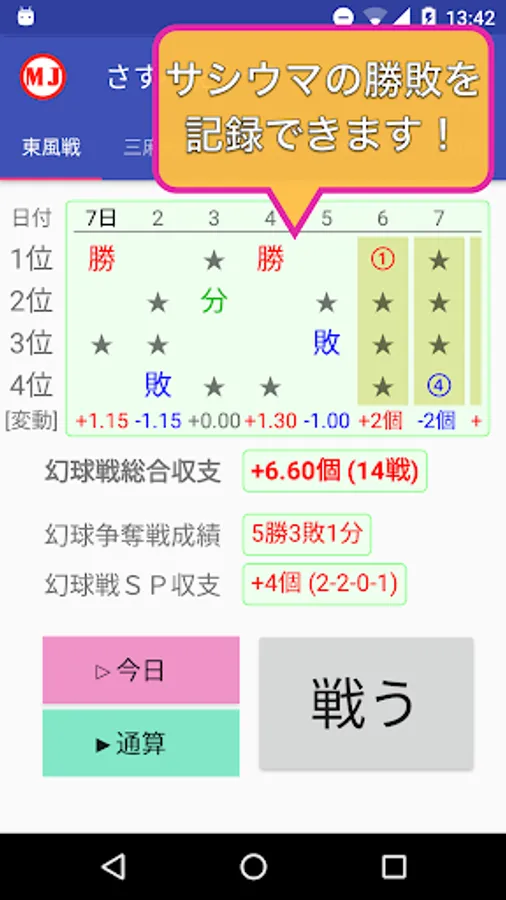 ・東風戦、半荘戦、三麻戦、幻球バトル、最強位バトルでそれぞれ管理できる!