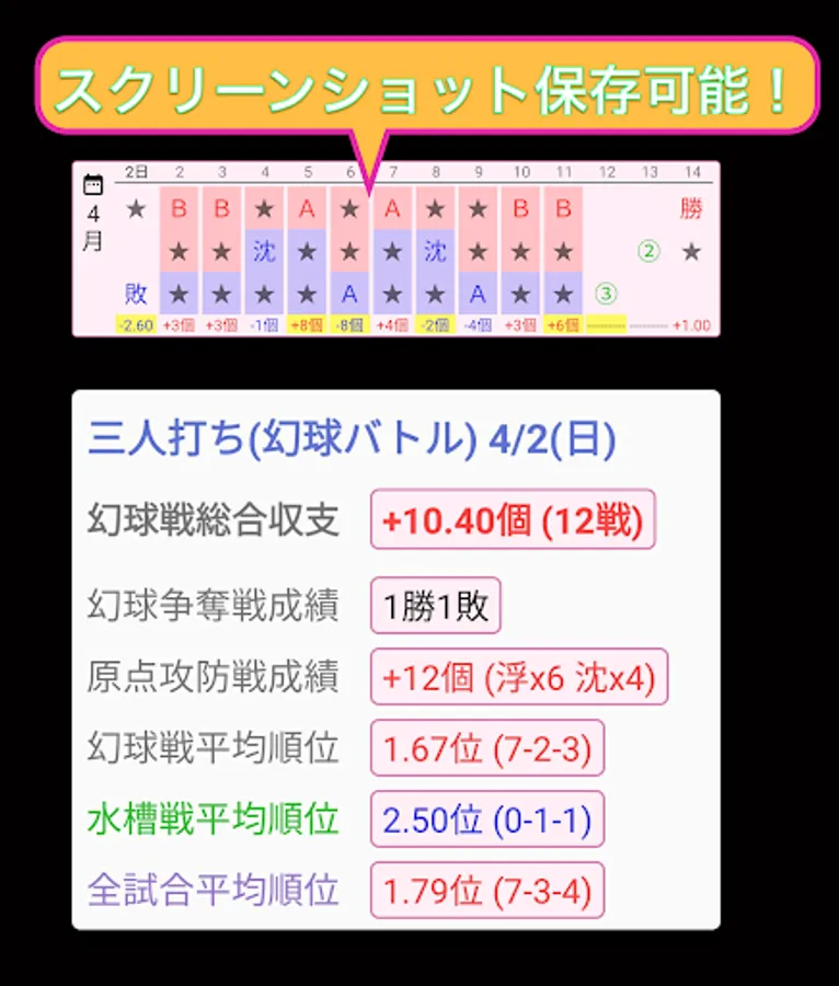 ・1日の成績、月ごとの成績、通算成績をひと目で確認できる!