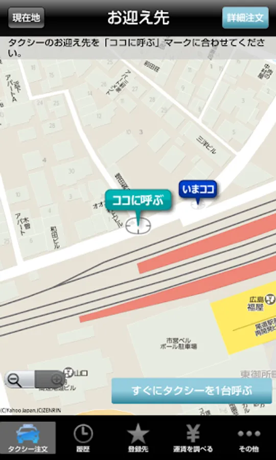 2. From [Taxi order], click the [Enlarge and specify location] button, and align the [Call here] mark with the taxi pickup location.