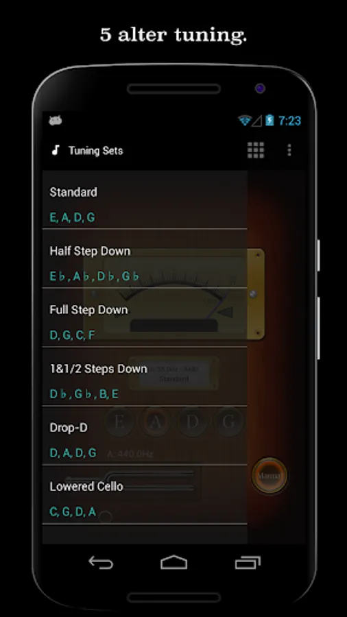 It detects the pitch of notes that picked up by a microphone, and it displays the difference from the right pitch.