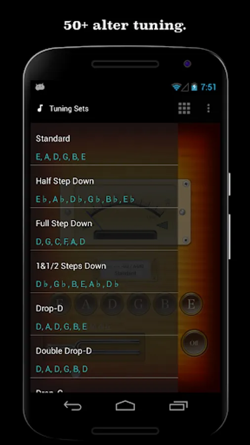 Currently, you can tune your guitar, Standard, Half Step Down, Full Step Down, 1&1/2 Steps Down, Drop-D, Double Drop-D, Drop-G, Drop-C, Drop-C&G, Drop-C(another set), Open D, Open E, Open E7, Open Dm, Open Em, Open Em7, Open Dmaj7, Open Dadd9, Open G, Open A, Open A(another set), Open Gm, Open Am, Open Am7, Open G7, Open Gmaj7, G6, Dsus(DADGAD), Open C, C6, Open F, F6, Taro Patch, G Wahine, Leonard's C, C Major(Atta's C), Keola's C, Mauna Loa, Old Mauna Loa, Dmaj7 Wahine, F Wahine and Double Slack F, Modal G(Gsus), Open C, Open C#, Open Cm, C Spanish, and Perfect 4th.
