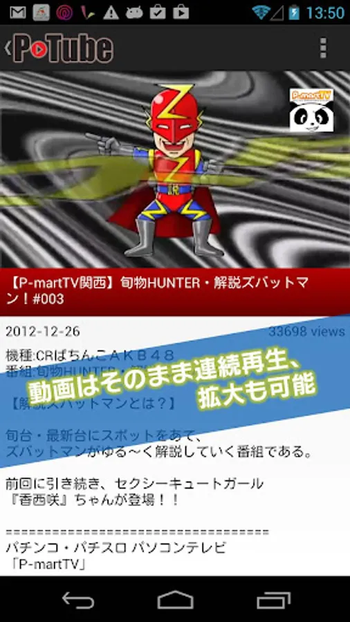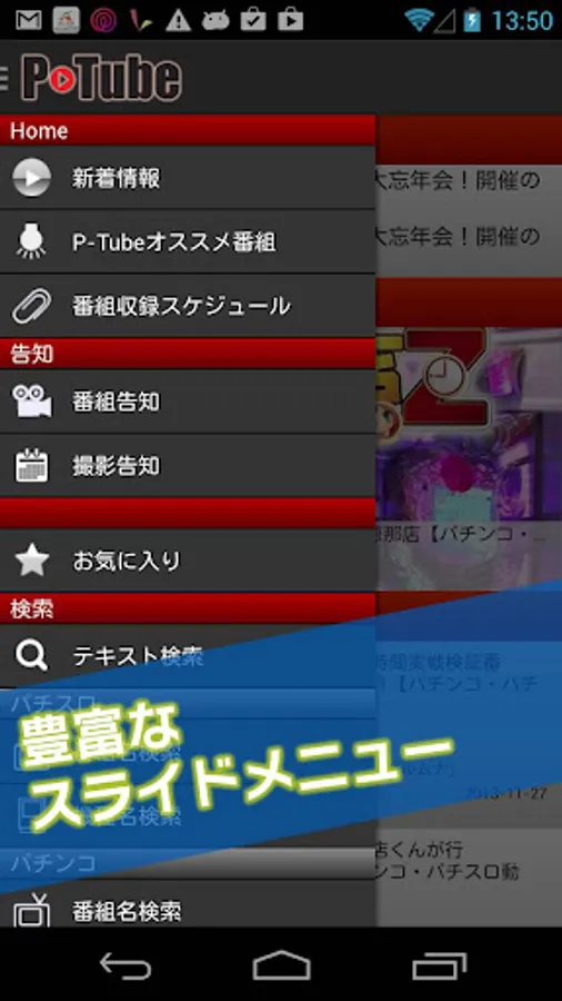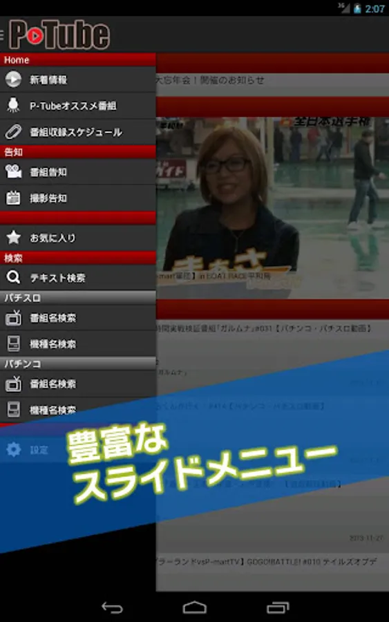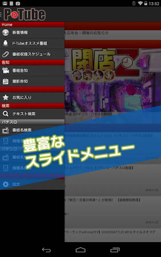 横スライドメニューや自動一覧更新でラクに素早く動画を楽しめます。