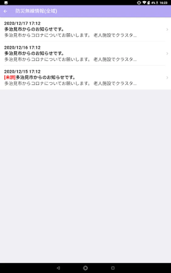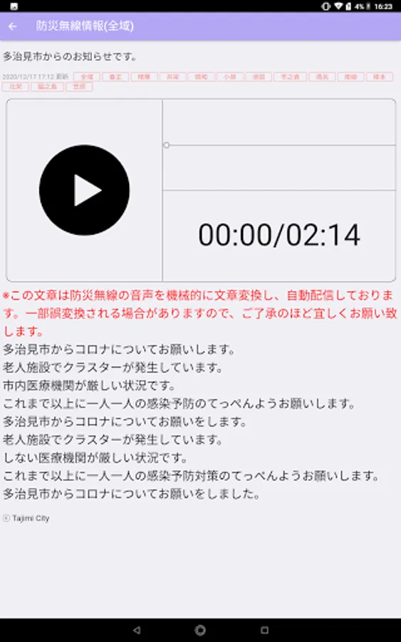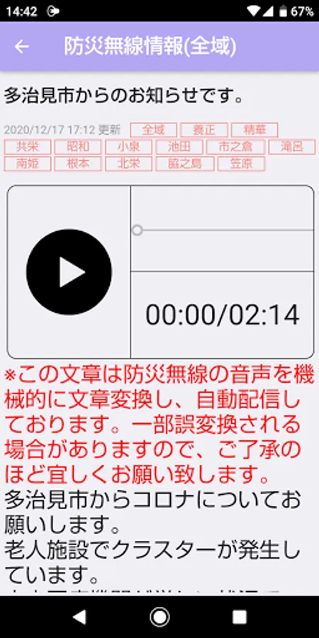 You can check the contents broadcast from the disaster prevention radio by voice and text.