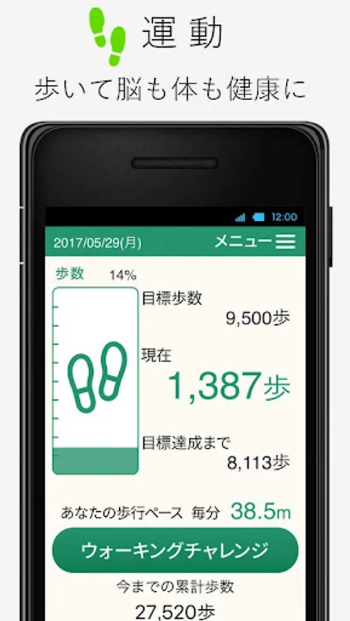 The exercise content of this app is "walking" ([number of steps] and [walking pace]) based on scientific grounds. If you turn on the "physical activity" setting of this application in the application settings of your smartphone device, you can measure [number of steps] (some models cannot be set), and set "location information" to [always on]. [Walking pace] can be measured.