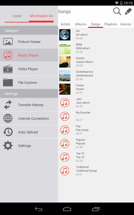 - Upload/Download: Transfer photos, videos, and music files between your Android device and the MiniStation Air.