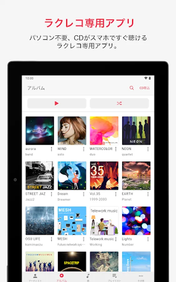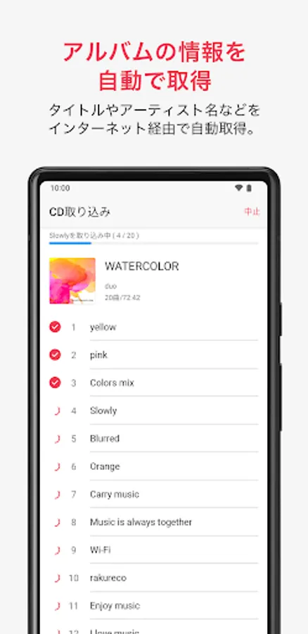 ・ Import from CD: You can import songs from the music CD set in "Rakureko". The album name, song title, artist name, and jacket photo are acquired from the Internet and displayed.