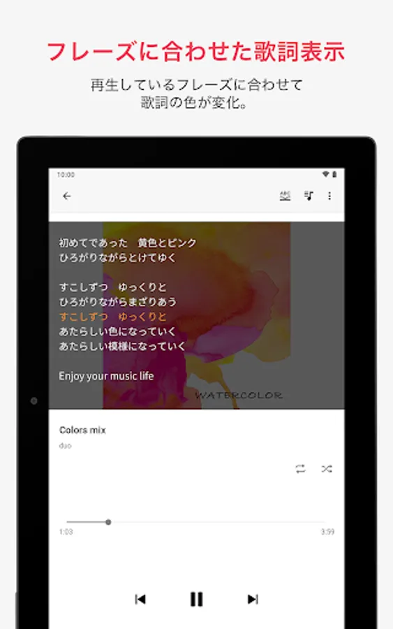・Lyrics display: The lyrics of the song being played are displayed, and the lyrics follow the progress of the song. The lyrics of the sung part are highlighted. *