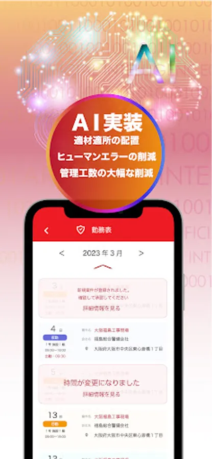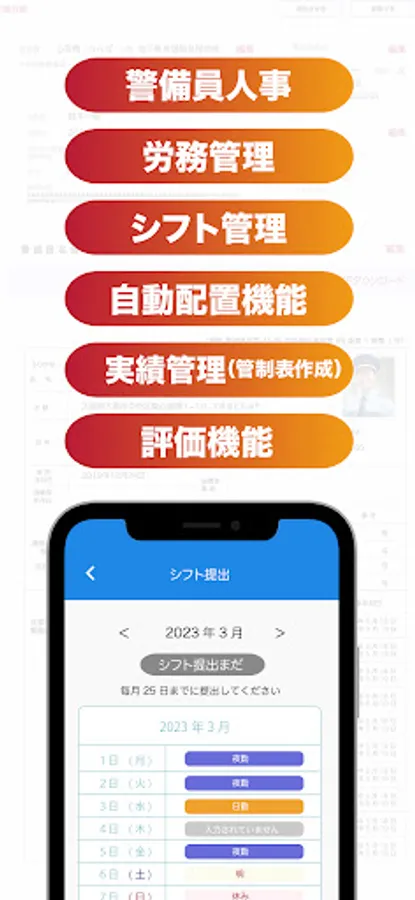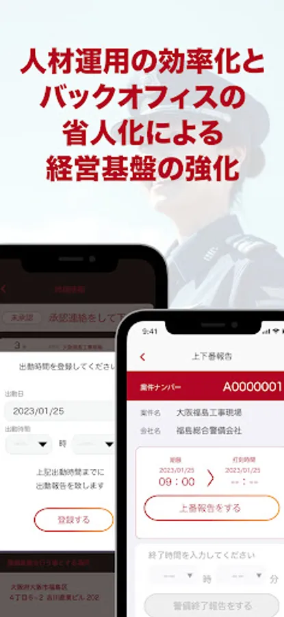 This system is a management system for the back office (control) and on-site operations of a human security company. Attendance management and personal personnel allocation and evaluation by specific employees, which have been done by telephone and fax until now, can be reduced to human error by utilizing the smartphone app and system cooperation of on-site security guards and automatic allocation and evaluation functions using AI. We aim to improve the efficiency of human resource management and save manpower in the back office by promoting reduction and activation of communication.
