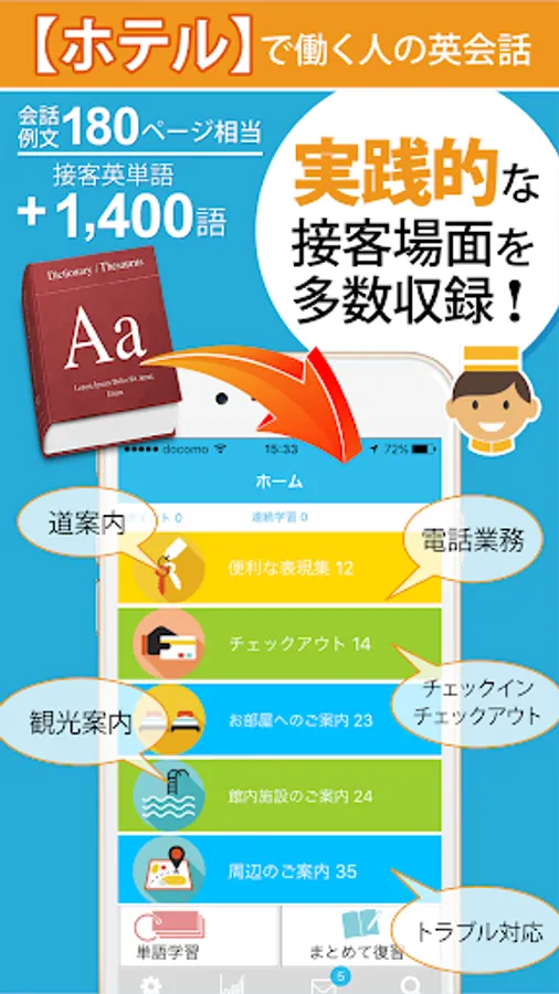 ※チェックイン、チェックアウト、道案内、観光相談、緊急対応、館内施設案内、電話による予約受付など業務ですぐに使える場面を多数収録