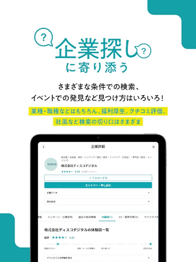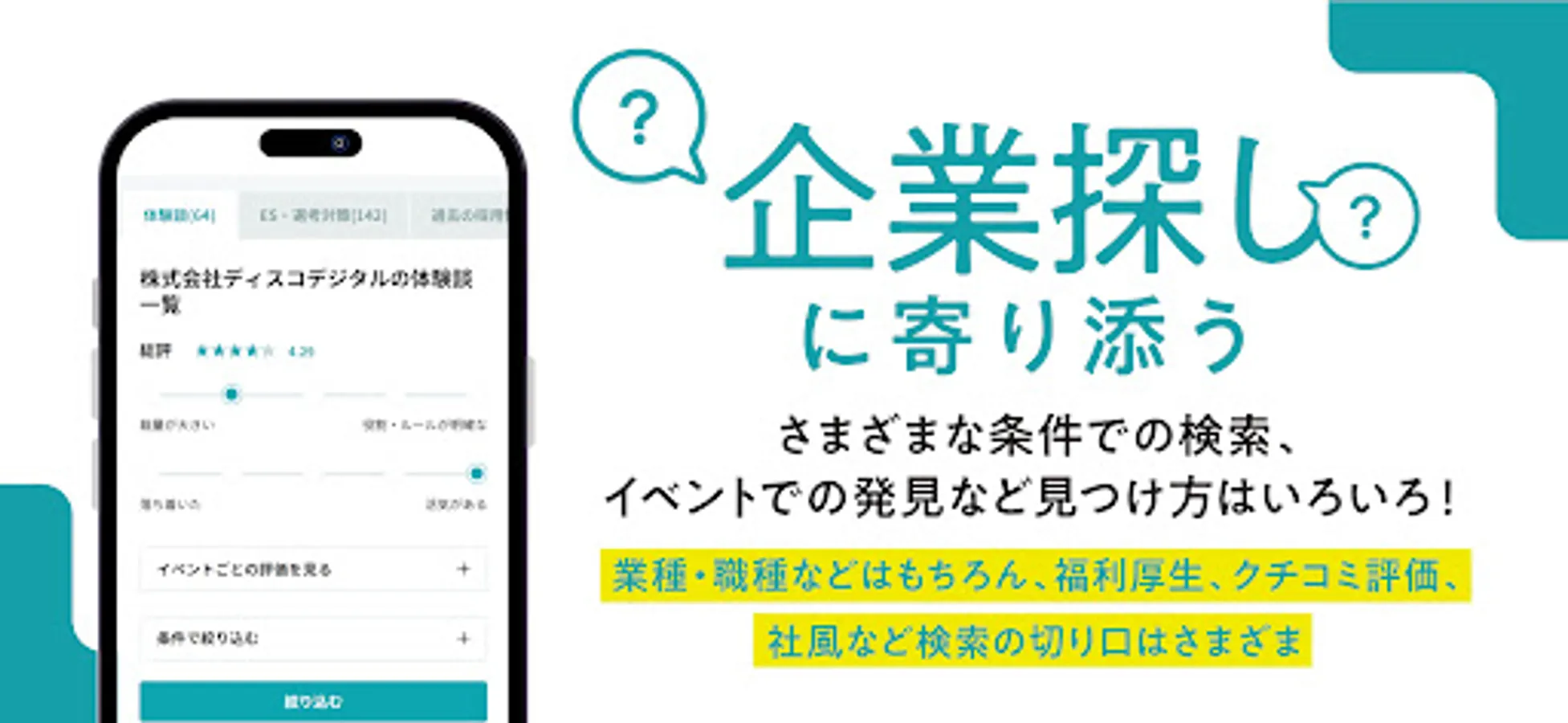 ●Various ways to search: In addition to general items such as industry, job type, and area, you can search and apply for internships and job research on many axes, such as benefits, word-of-mouth evaluation, and corporate culture.