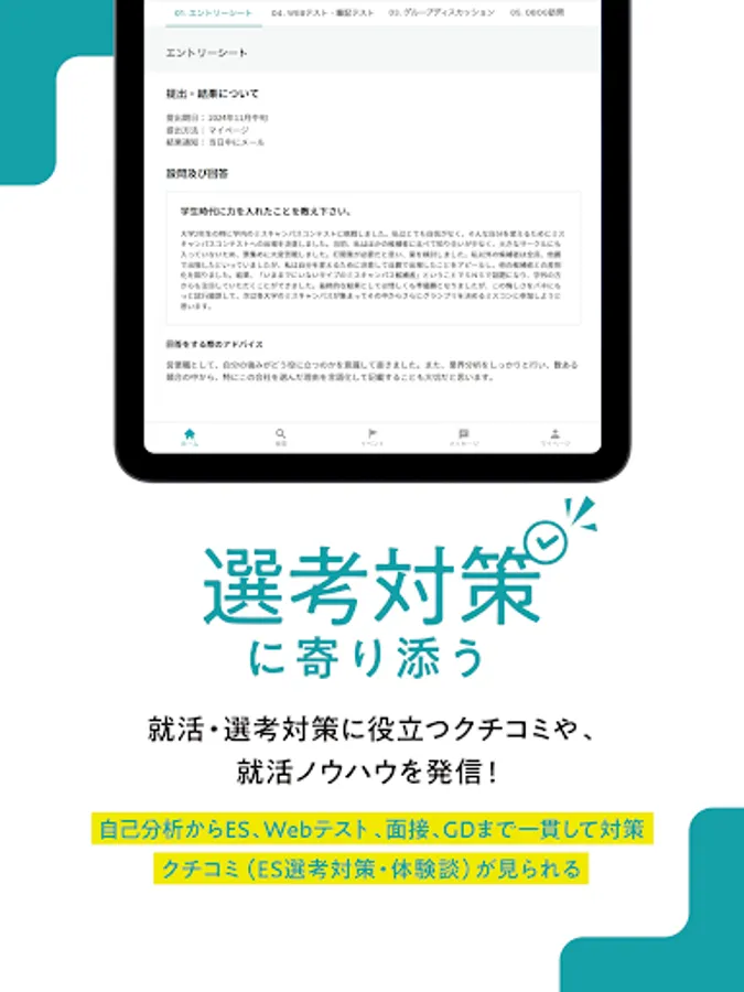 Of course, the same functions as the web can be used in the application as well. From self-analysis to ES, web tests, interviews, and GD, you can consistently take measures.