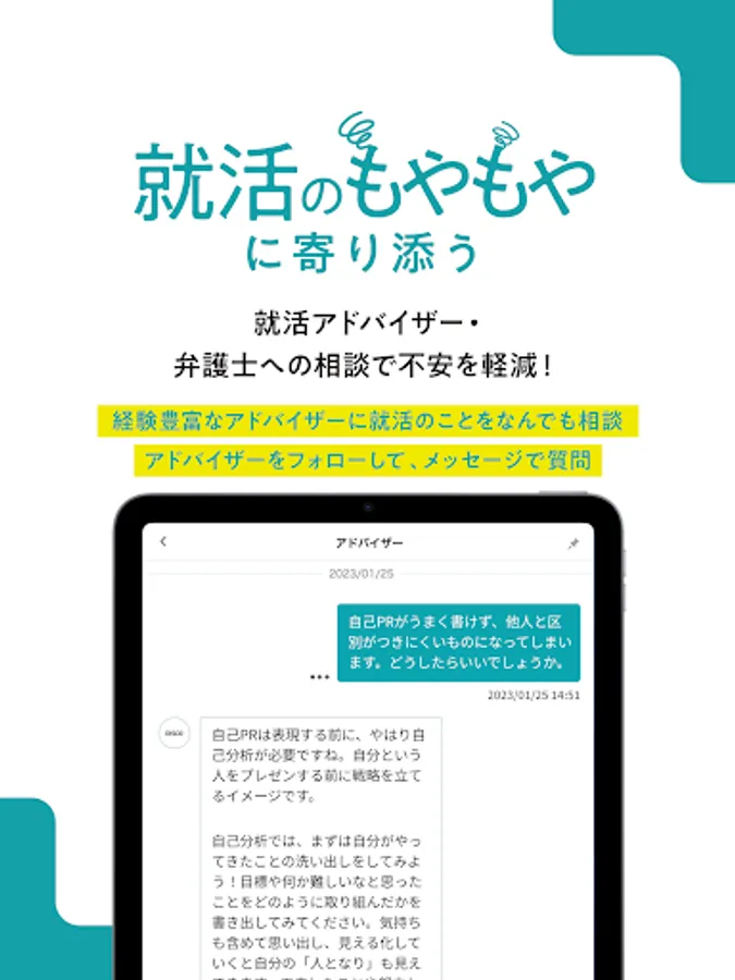 ● You can consult anything about job hunting: If you follow a job hunting advisor or a lawyer advisor, you can consult with a message. Experienced and reliable advisors will answer your concerns, anxieties and troubles during job hunting and job hunting preparations.