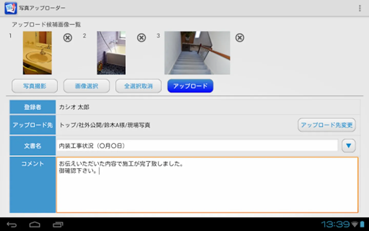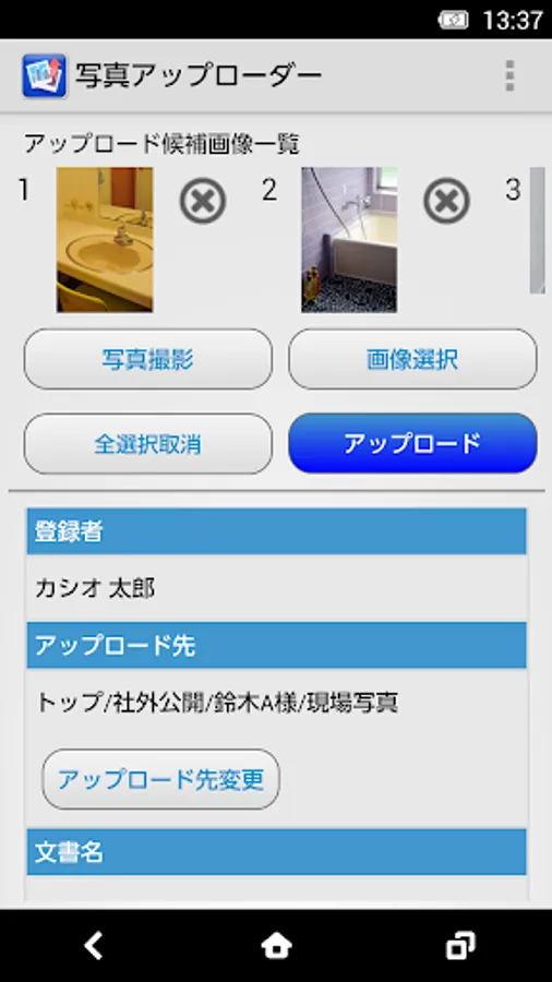 「写真アップローダー」はAndroid端末(Ver 4.0.3以降)を利用して、施工の進捗報告や現場の証明写真などで撮影した画像データを、カシオのクラウドサービスであるドキュメントバインダーの指定フォルダに簡単に登録ができる、便利なアプリケーションです。