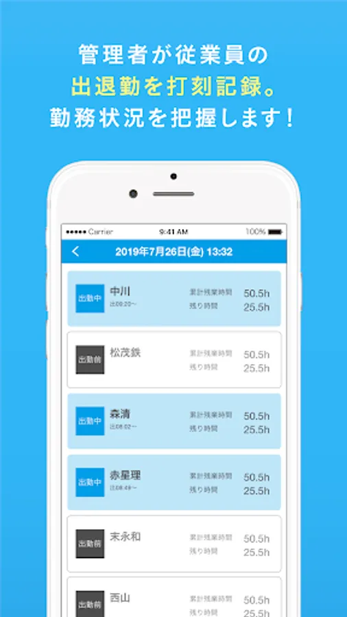 上司が管理する部下たちの、残業の状況を一覧で確認することができます。