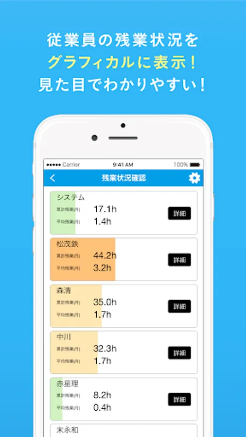 また残業の数値だけでなく、わかりやすくグラフィカルなバーとして表示してあるので、パッと見るだけでも注意すべきメンバーの確認を行うことができます。