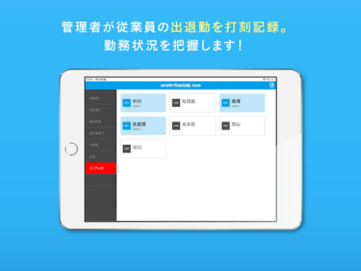 部下に打刻させることができないシーンに合わせて、上司のアプリから各部下の打刻を行うことができます。