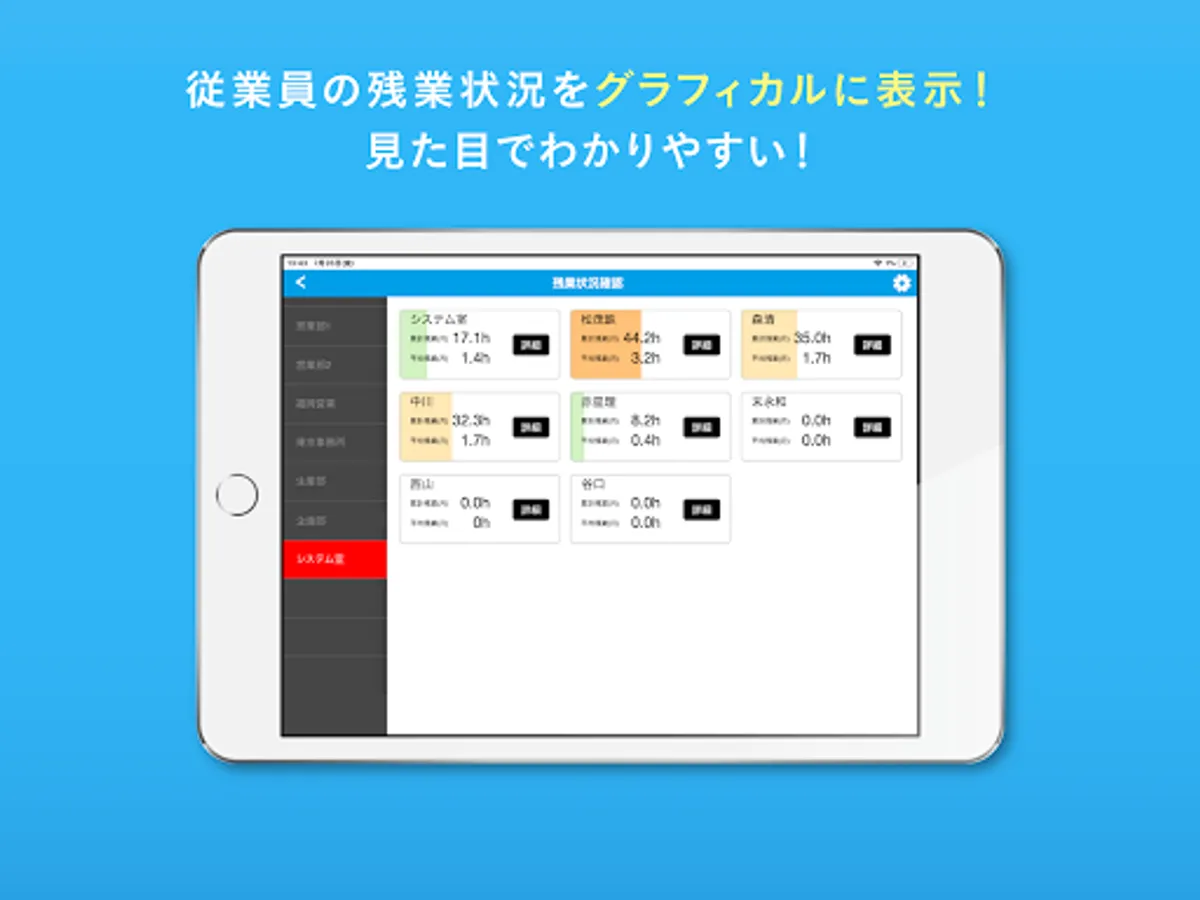 残業が多い順番に並んでいるため、上にいる部下ほどに注意して残業管理を行うことができます。
