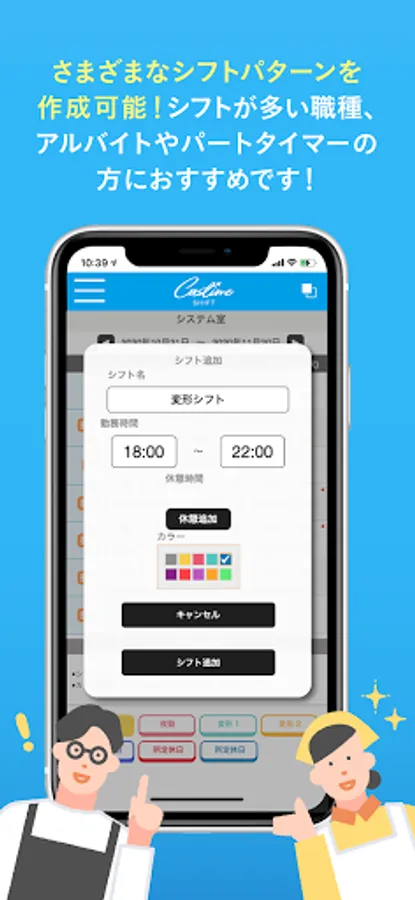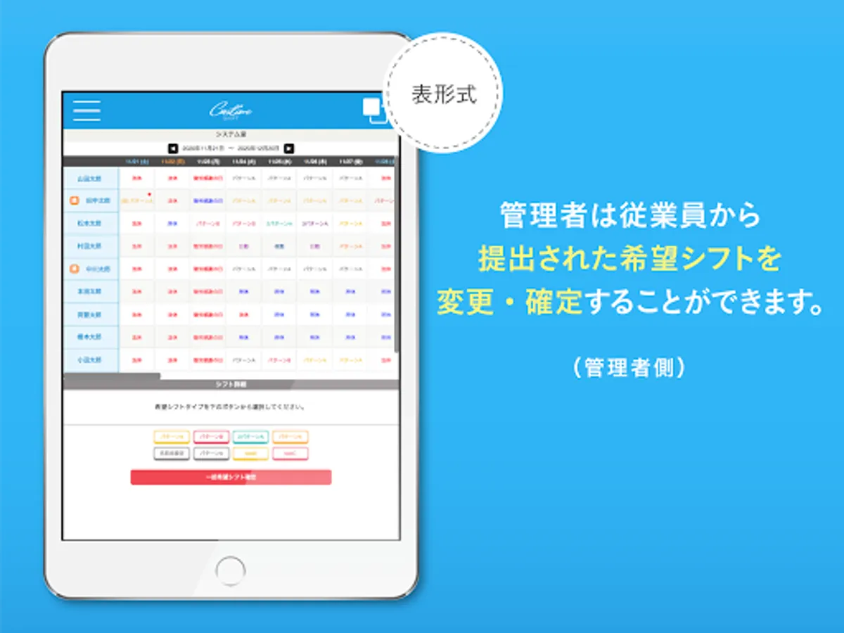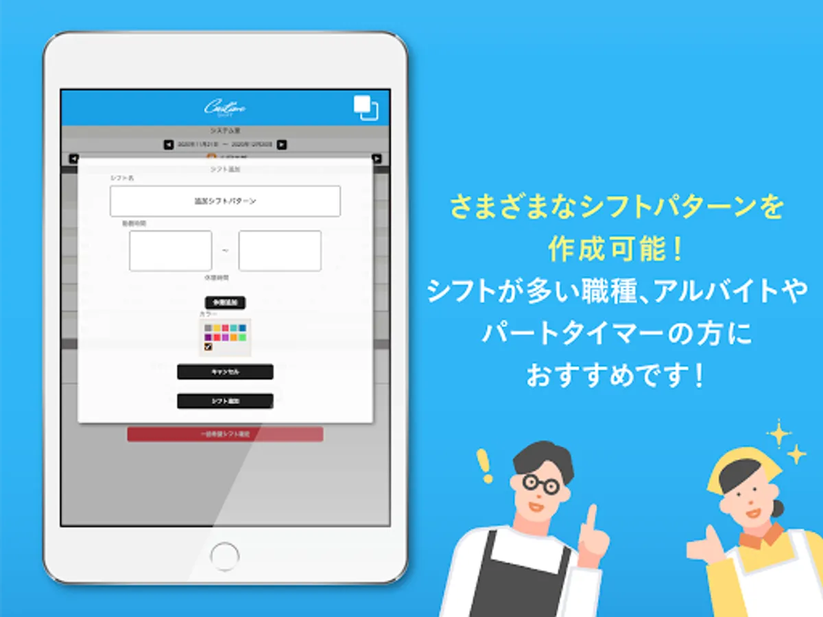 By registering frequently used shift time patterns, you can easily register shifts by tapping the desired shift or changing the shift.