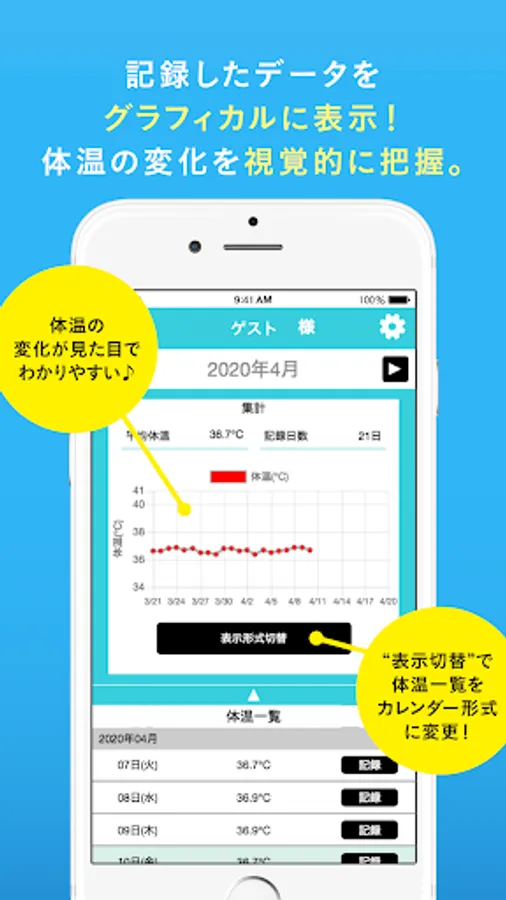 You can visually understand the past body temperature record with a graph display.