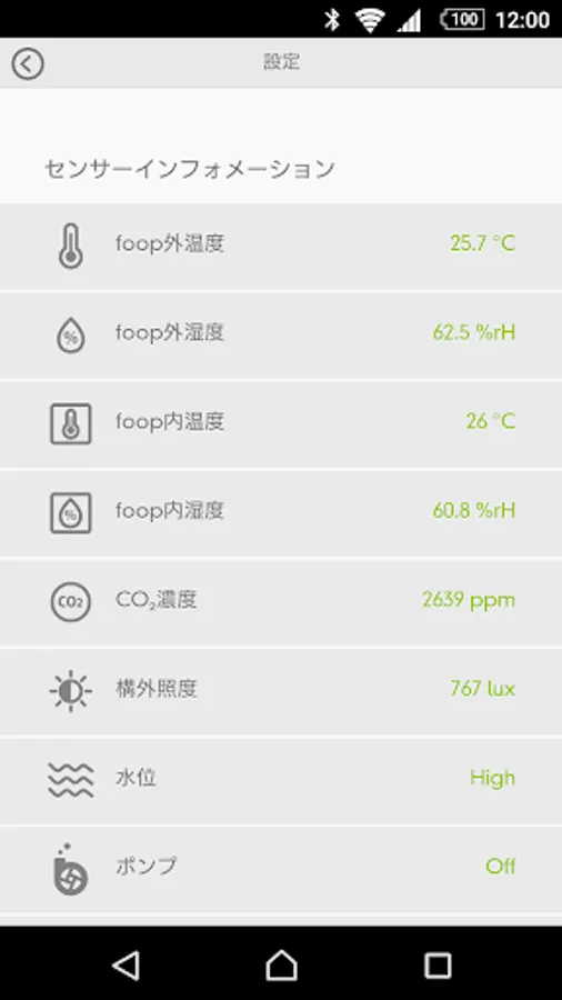 With the App, you can check environmental conditions inside and outside of foop, including temperature, humidity, CO2 concentration, brightness, water level, the speed of the dedicated fans.