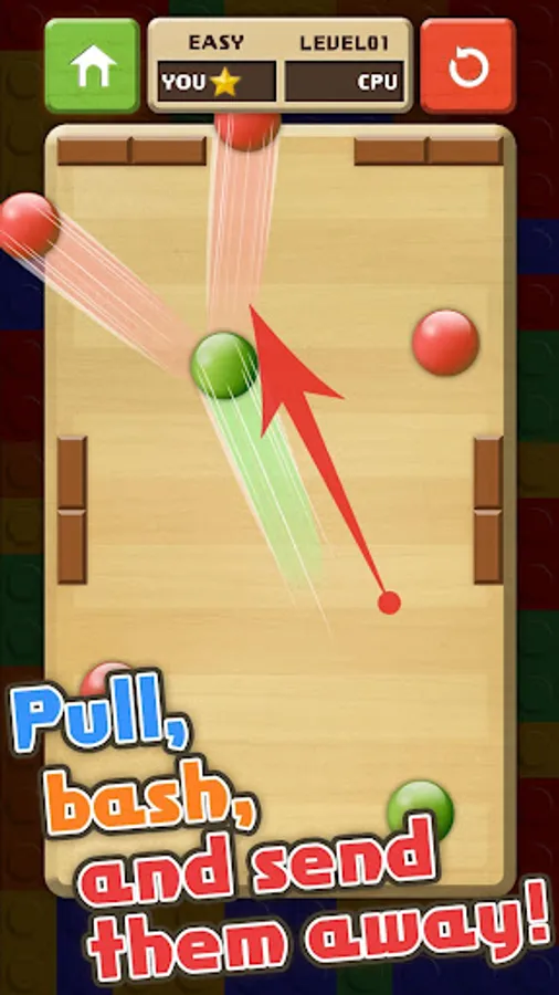 Pull and send away your own balls (green) and bash them against your opponent’s balls (red)!