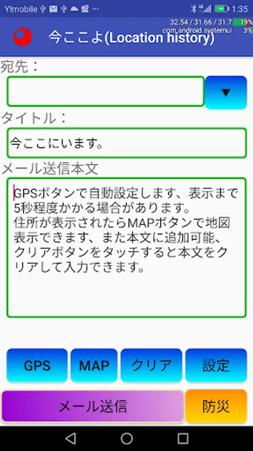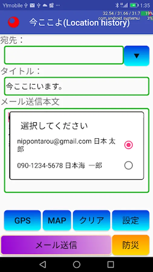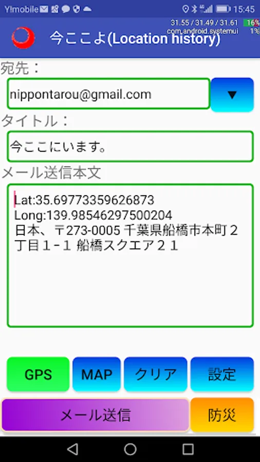 1.GPSボタン:緯度・経度で現在地を取得してメール本文に住所を設定します。