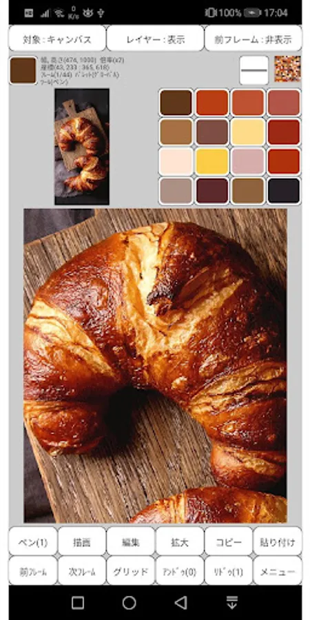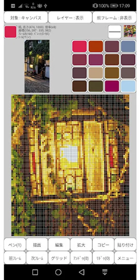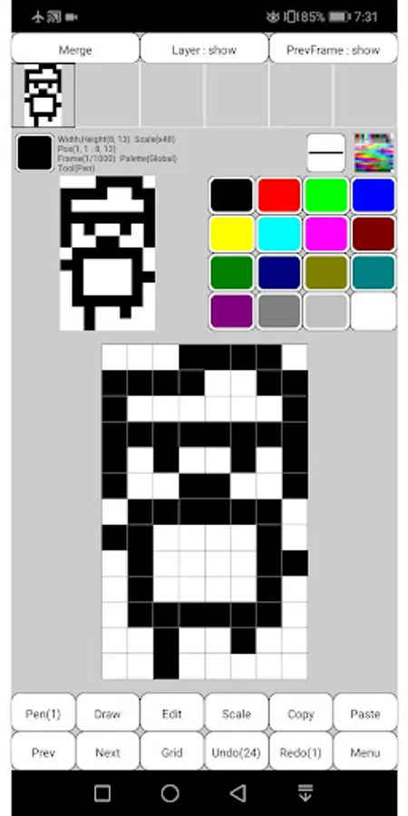 Basic functions such as fill, line, rectangle, circle, flip, rotate, enlarge, copy, paste, dropper, and undo are available.